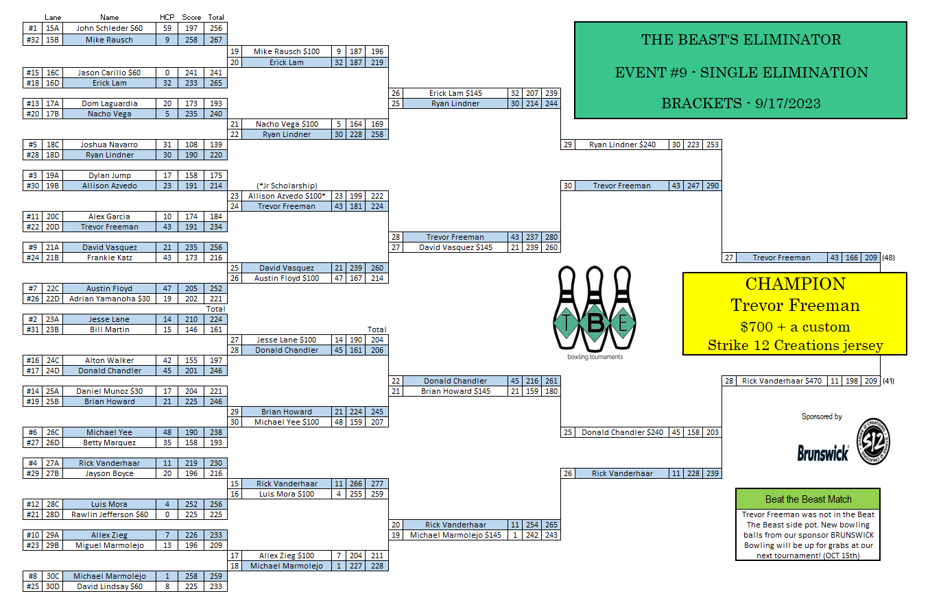 This month’s champ was not in the beat the beast side pot. we will have new bowling balls from brunswick bowling at october 15th’s tournament